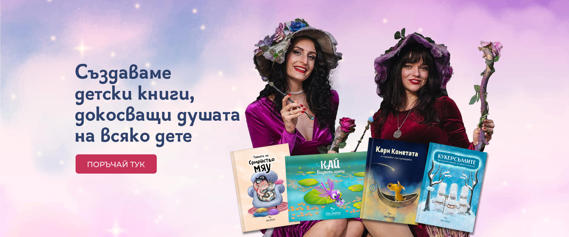 Ние сме писател и художник, които черпят своето вдъхновение от вълшебната вселена на въображението. Съчетаваме перо и четка, за да създаваме автентични приказки с дълбок смисъл.